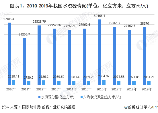 2010-2019年,我國(guó)水資源總量整體呈現(xiàn)波動(dòng)變化的趨勢(shì),2011年,我國(guó)水資源總量為23256.7億立方米,為近年最低值,2016年,我國(guó)水資源總量為32466.4億立方米,為近年最高值;與此同時(shí),人均水資源量也處于不穩(wěn)定狀態(tài),2019年為2051.21立方米/人。按照國(guó)際公認(rèn)的標(biāo)準(zhǔn),我國(guó)處于輕度缺水的狀態(tài)(人均水資源量低于3000立方米)。