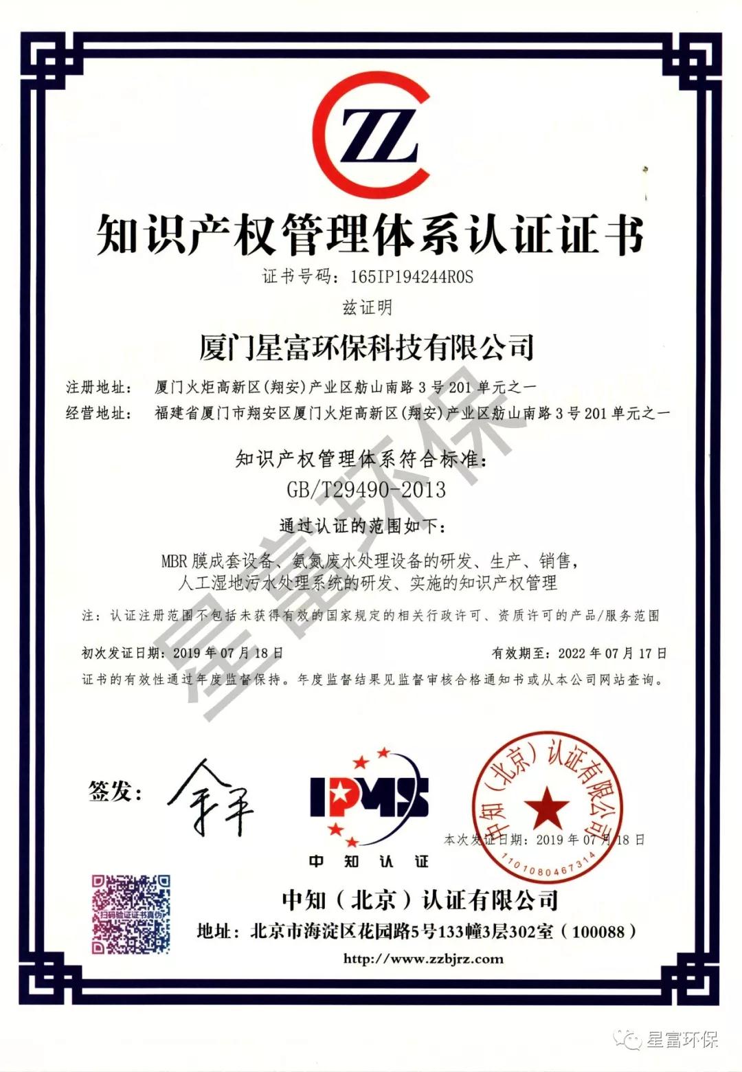 2019年07月18日,收到由中知(北京)認(rèn)證有限公司頒發(fā)的《知識(shí)產(chǎn)權(quán)管理體系認(rèn)證證書(shū)》,這意味著星富環(huán)保在知識(shí)產(chǎn)權(quán)領(lǐng)域獲得到重要認(rèn)可,在知識(shí)產(chǎn)權(quán)方面得到進(jìn)一步規(guī)范和在綜合競(jìng)爭(zhēng)力得到進(jìn)一步提升。